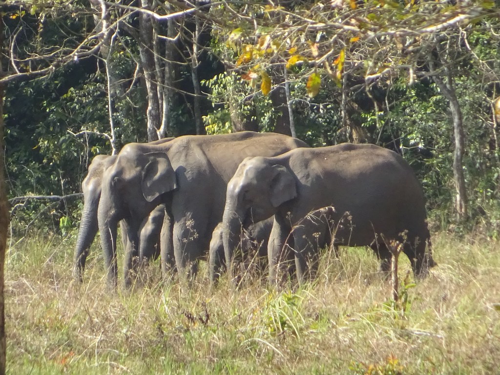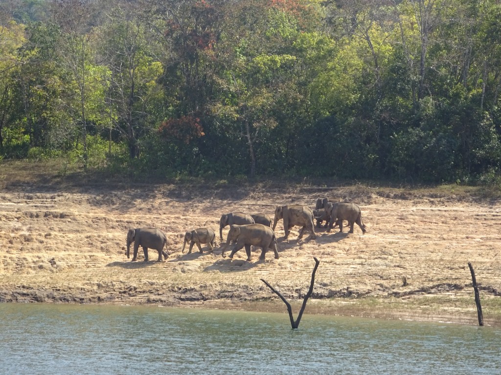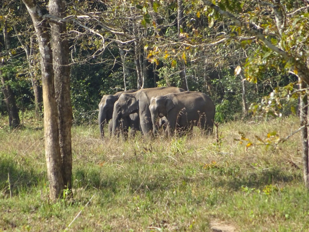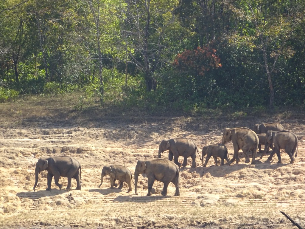 It was late in the afternoon and was getting quite hot too. Our guides suddenly alerted us on spotting some wildlife quite far away. As we had a camera with a good zoom option, we scanned the area to see a herd of elephants. Quickly getting on the bamboo raft, we started rowing towards the elephants so as not to miss them. It was quite an experience to see huge wild elephants from close range. We got off the raft on the opposite side to observe, under strict instructions by our guides to not make any noise. We observed it was a family of 9 elephants including 3 baby elephants. It was an amazing sight to watch the head of the family taking the lead, cautiously taking each step and protecting the little ones.