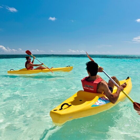 Kayaking – Peacefully paddle through the mesmerizing marine biodiversity beneath the crystal clear shallow waters of the Indian Ocean. This non-motorized sport lets you explore lagoons surrounding Maafushi effortlessly.